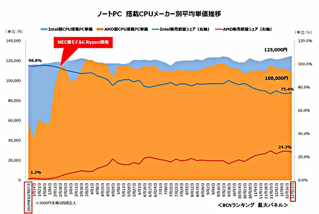 変化が起きたのは2月。NECがノートPCの春モデルでRyzenを採用したことが引き金となり、状況が一変した。その後も販売台数シェアでAMDが年間を通じてじりじりとインテルを追い上げ、ついに12月23日週には24.3%まで追い詰めるという快進撃だった。