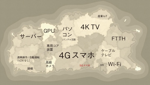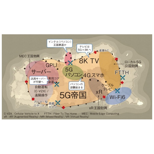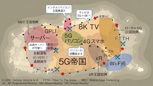 5Gの普及によって、スマートフォンだけでなく、多様な機器やサービスに大きな変革を迫る様子を示した。5Gサービスが登場したばかりの現在はまだ、各分野は平和裏にすみ分けている_図1a。しかし、5Gサービスが本格化する2022年頃以降は、さまざまな新事業(勃興する王国や公国)が生まれるだけでなく、多くの既存事業が変革を迫られ、“5G色”に染まっていかざるを得なくなる図1b。それに失敗すると、大手企業でも衰退の危機に直面する可能性もある。